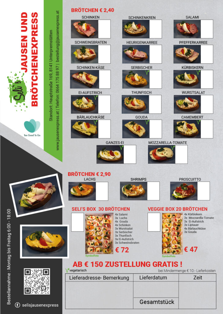 Download Liebe Kundinnen und Kunden, Falls Sie Speisekarte oder Bestellschein für Ihre Brötchen Bestellung benötigen, können Sie diese hier herunterladen. Speisekarte zum Ausdrucken herunterladen Brötchen Bestellschein zum Ausdrucken herunterladen